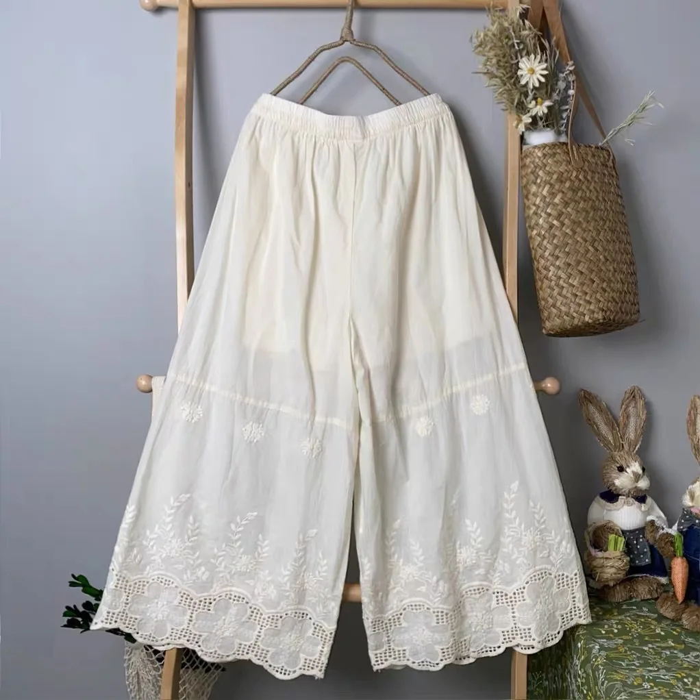 Sweet Floral Embroidery Eyelet Lace Wide Leg Pants